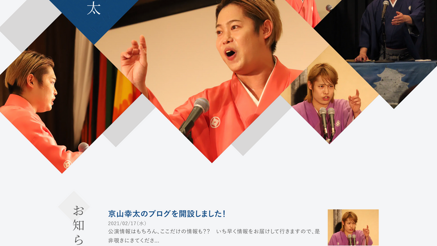 サイト上部のヒーローセクションのインパクトあるダイアモンド状のイメージタイルからは、浪曲師のみならず時にはお笑い芸人として、時にはYoutuberとして、幅広く活動されるアーティストである京山幸太氏の様々な「顔」を見ることが出来ます。